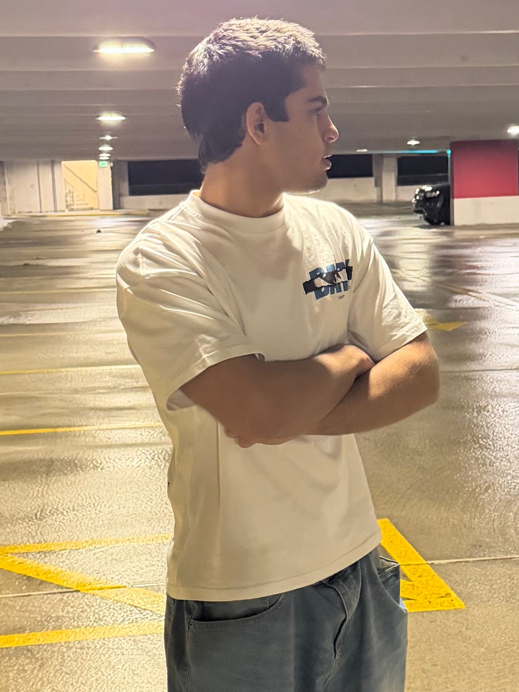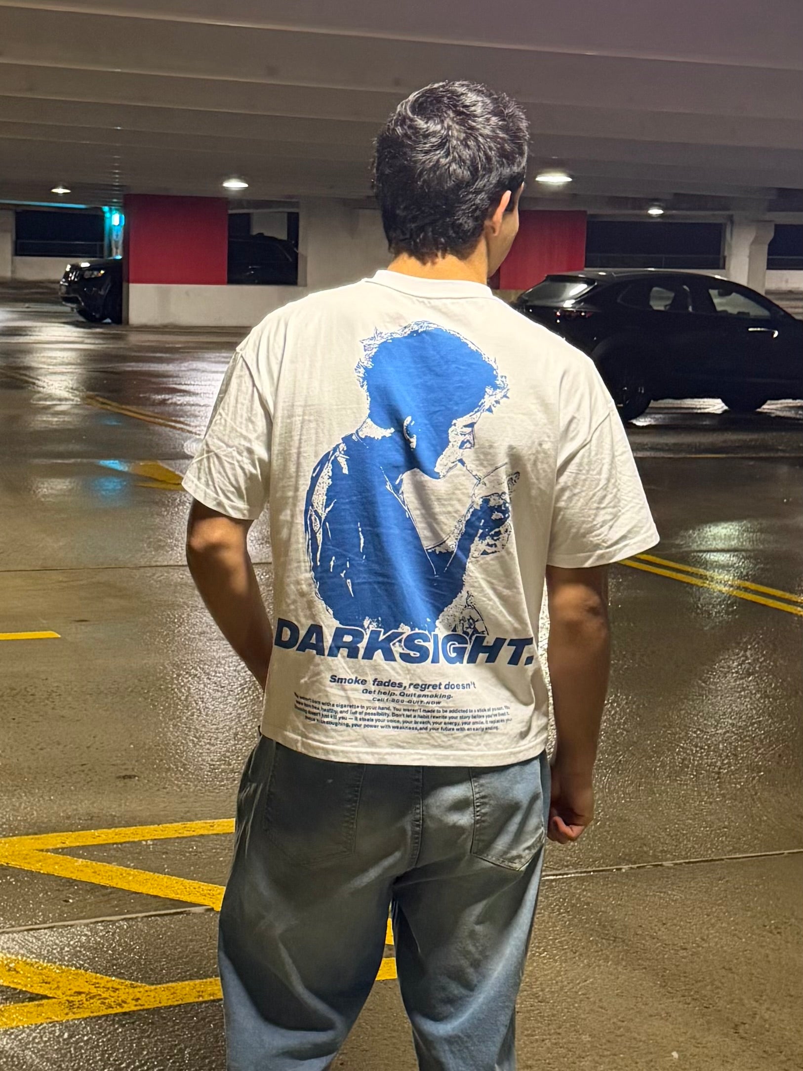 Model is 5’10 165 wearing a small. White heavyweight t-shirt constructed from 100% cotton at 220 GSM. Oversized, boxy fit with a structured drape. Features a small distorted Darksight logo on the front and a bold blue smoking silhouette graphic on the back, anchored by the statement “SMOKE FADES. REGRET DOESN’T.” Designed to contrast purity with consequence. 10% of all sales from this drop will be donated to a donation center selected specifically for this release.